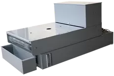 Wytrzymała, lakierowana proszkowo stalowa konstrukcja z dużymi drzwiami przesuwnymi z odpornego na zarysowania szkła laminowanego oraz dużymi bocznymi drzwiami.