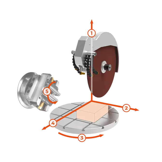 Dzięki opatentowanej technologii 5‑osiowej, detale mogą być cięte pod dowolnym kątem – precyzyjnie, powtarzalnie, szybko i łatwo. Wszystkie osie mają precyzyjną regulację i pozostają wolne od drgań podczas procesu cięcia, co znacząco ułatwia dokładną pracę. Zdolności pozycjonowania i ruchu osi w połączeniu z systemami mocowania umożliwiają precyzyjne cięcie bez czasochłonnego przezbrajania. Wszystkie konieczne cięcia mogą być wykonywane sekwencyjnie i automatycznie – nawet w przypadku dużych detali.